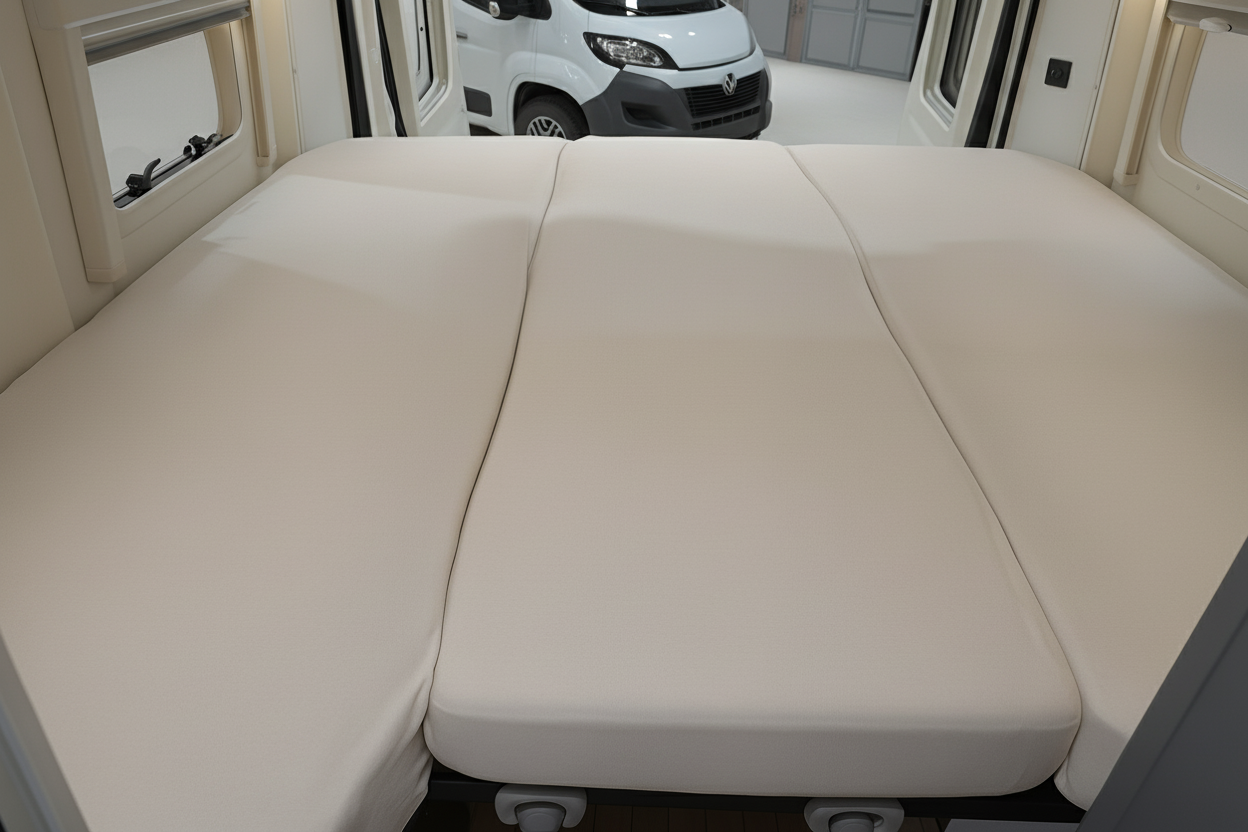 Many campervan and motorhome beds start as three separate cushions during the day and pull together at night to make a full double. Normal bedding never fits both setups properly — but this set is made exactly for beds like yours.