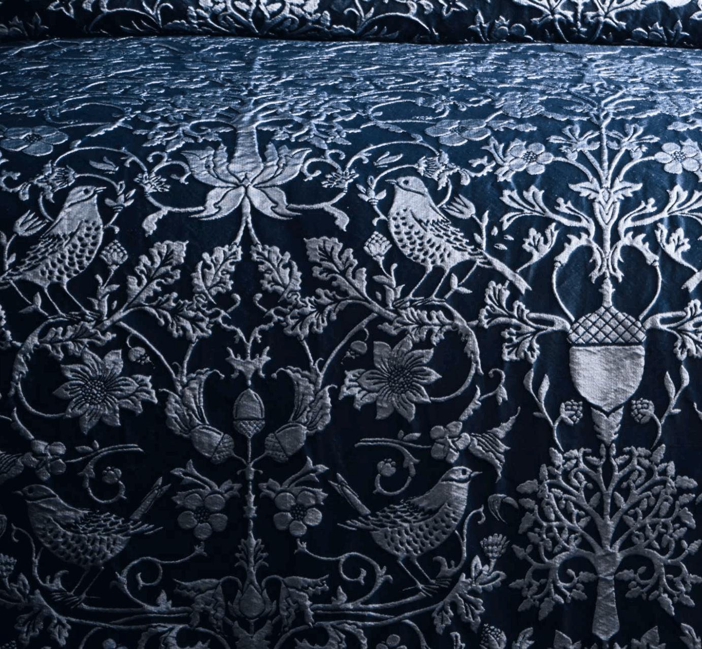 Influenced by the traditional 19th-century arts & crafts style, the Oak Tree bedding collection captures the values of these artists. Featuring hand-drawn natural elements and simple woodblock shapes all produced in a high quality woven relief jacquard in a deep Navy colour palette this bedding set is a truly opulent addition to your bedroom.