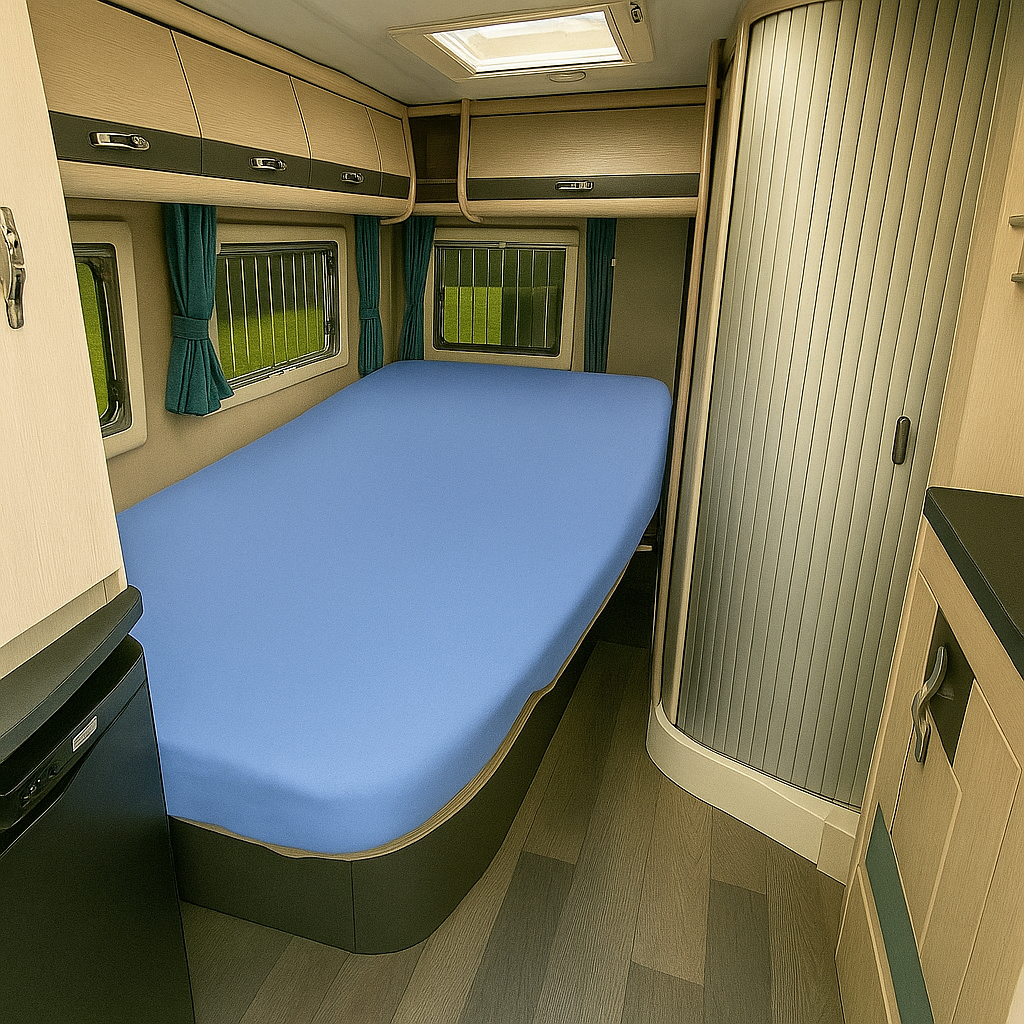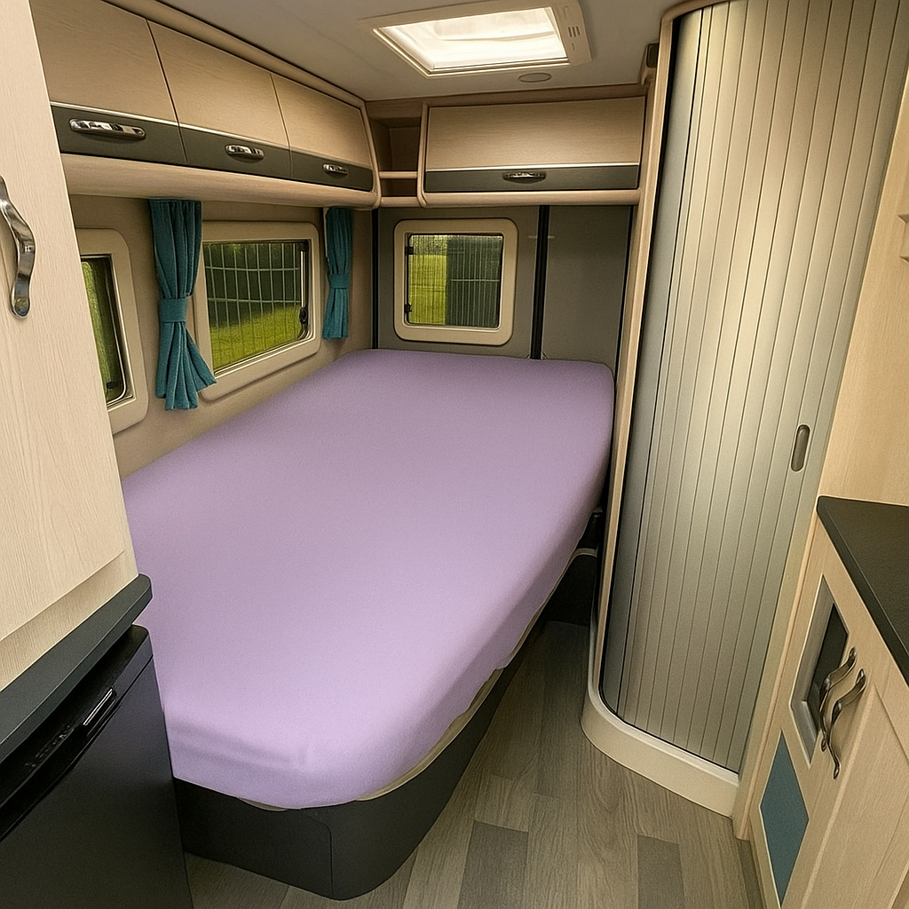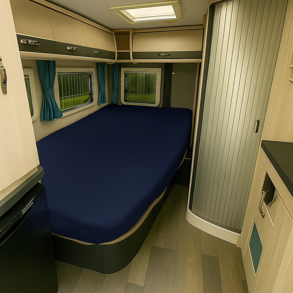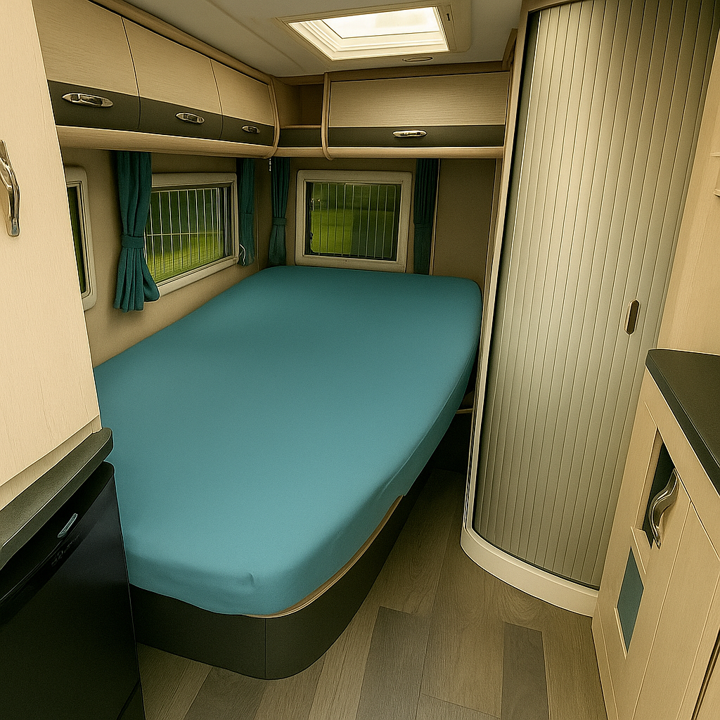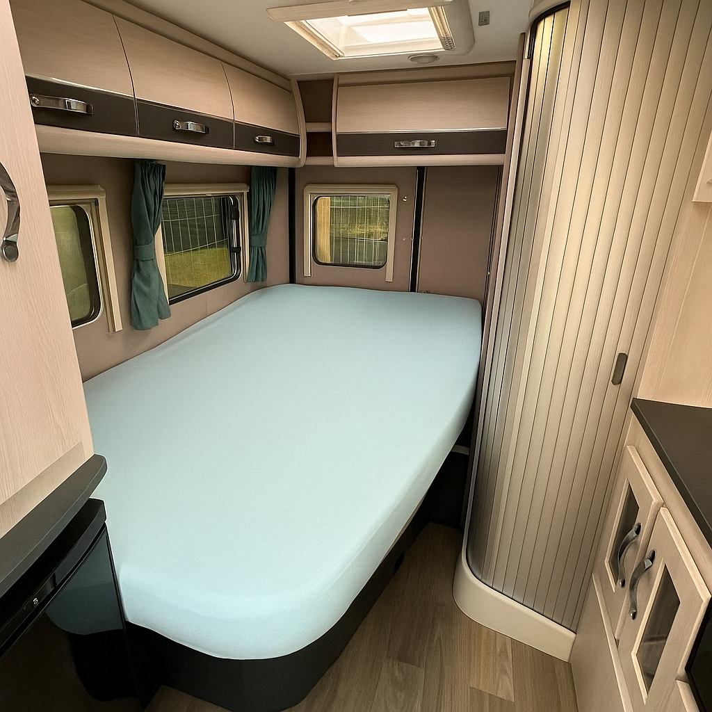 Our Signature Fitted Right-Hand Sheet is made for caravanners and motorhomers who are fed up with standard rectangular bedding that never fits a right-hand French bed properly. We cut every sheet to match the exact angled corner and unique mattress shape — giving you a precise, secure, made-to-measure finish that transforms the look and comfort of your caravan bedroom.