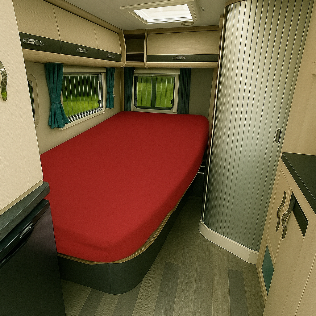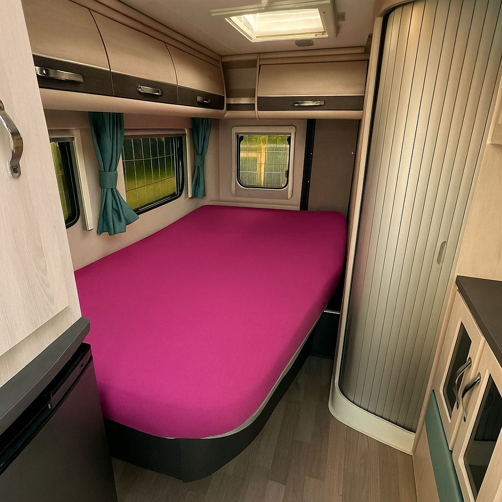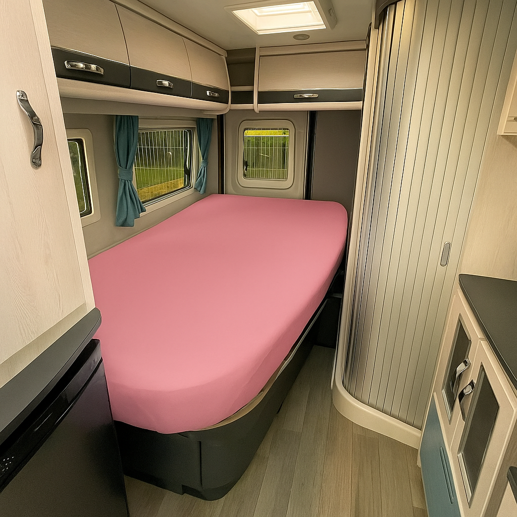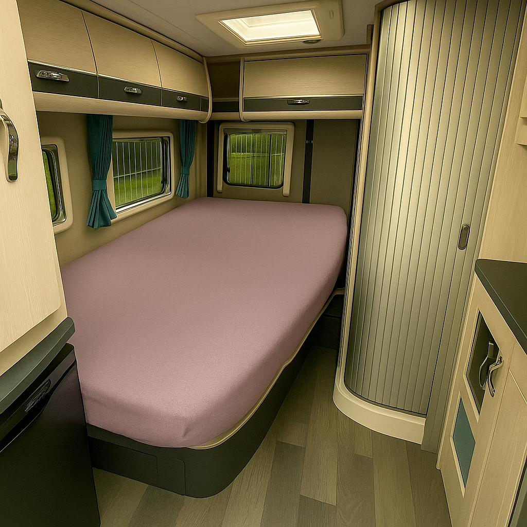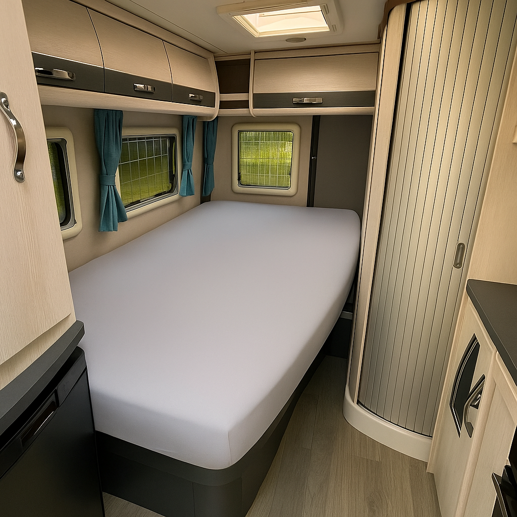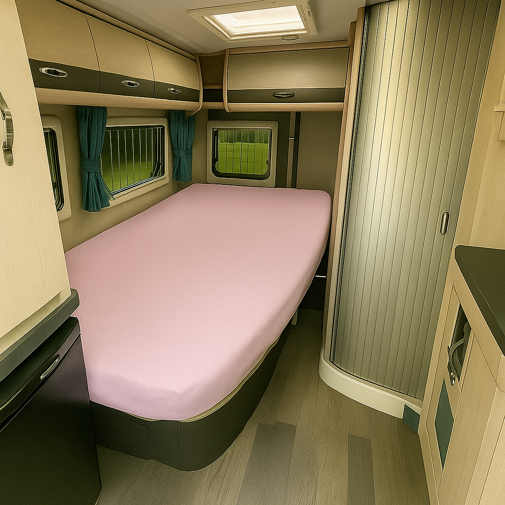 Our Signature Fitted Right-Hand Sheet is made for caravanners and motorhomers who are fed up with standard rectangular bedding that never fits a right-hand French bed properly. We cut every sheet to match the exact angled corner and unique mattress shape — giving you a precise, secure, made-to-measure finish that transforms the look and comfort of your caravan bedroom.