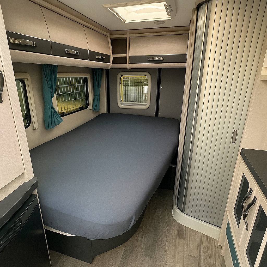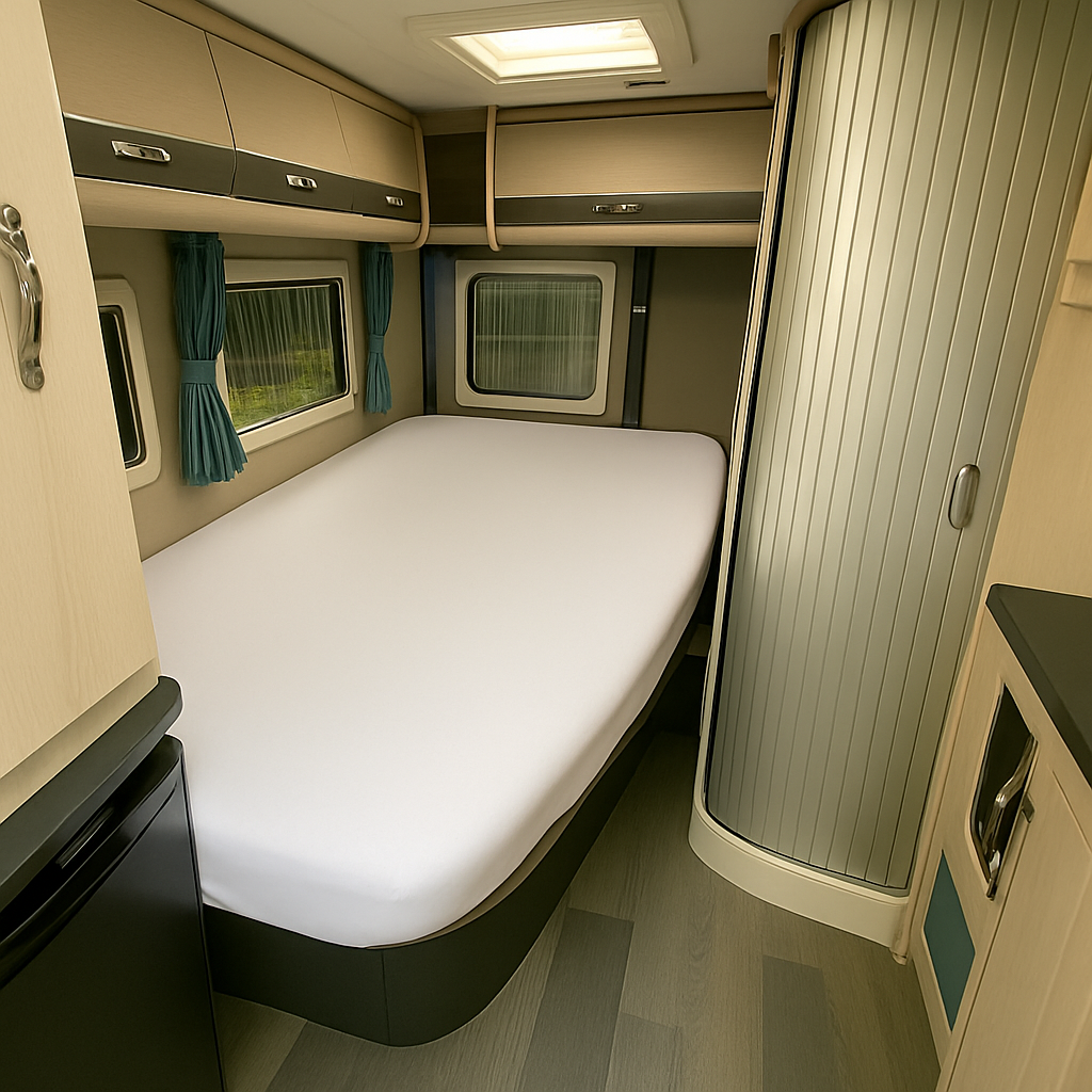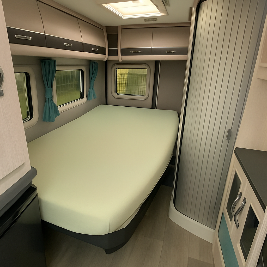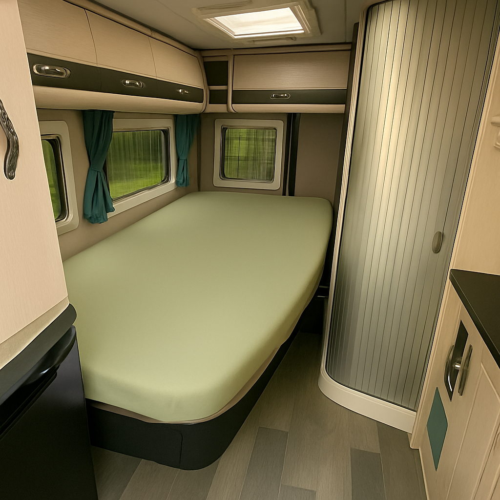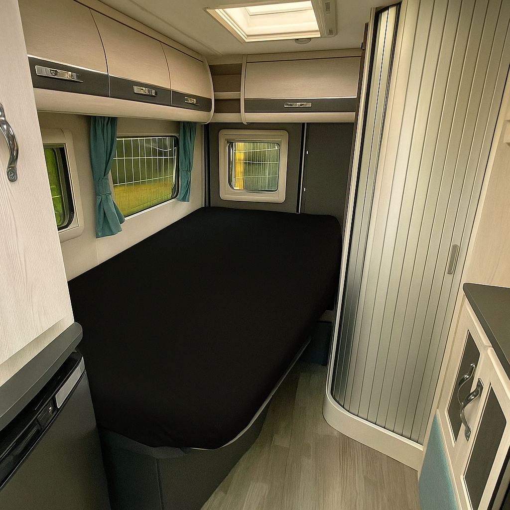 Our Signature Fitted Right-Hand Sheet is made for caravanners and motorhomers who are fed up with standard rectangular bedding that never fits a right-hand French bed properly. We cut every sheet to match the exact angled corner and unique mattress shape — giving you a precise, secure, made-to-measure finish that transforms the look and comfort of your caravan bedroom.