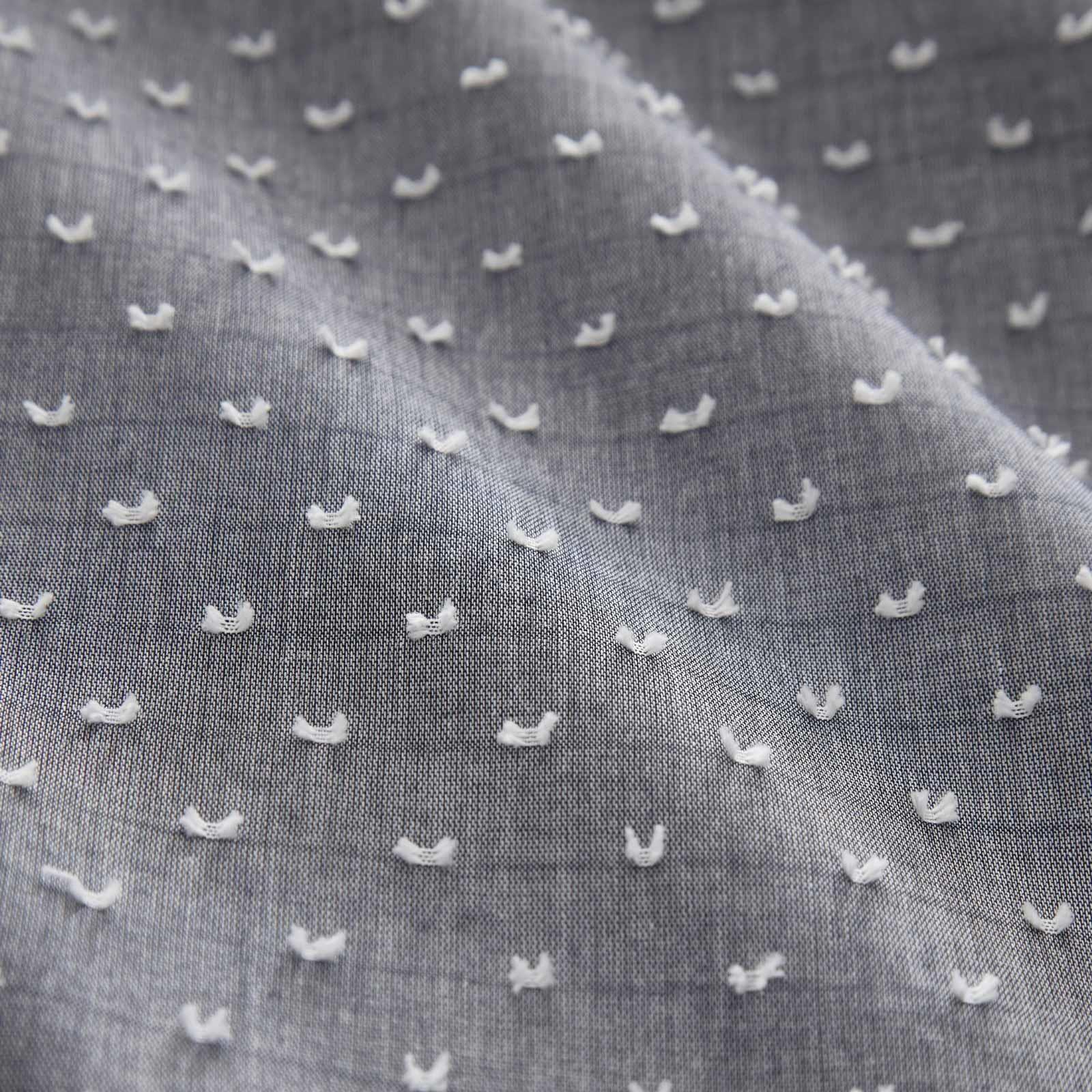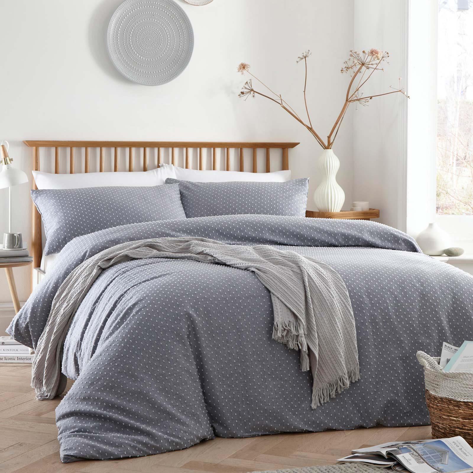 Woven on to a soft touch 100% cotton, this gorgeous new weave features a simple white tufting across the entire face of the duvet cover and pillowcase. The denim blue grey colour will look stunning in any room and features a plain, colour matching reverse.